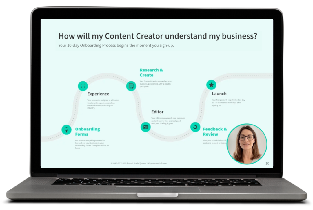 You’ll learn why 1,000+ B2B companies have been using 100 Pound Social since 2017 to boost their brand online with bespoke social media and blog content crafted by a dedicated UK-based professional writer and editor—at a fraction of the cost of hiring a social media manager in-house.